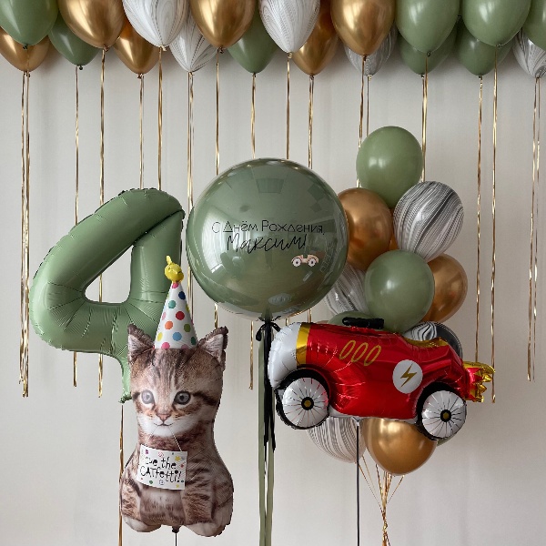 Готовое решение «Кот и машина» в интернет-магазине OCEAN BALLOONS. Заказать с доставкой! Тел.: +7 (495) 773-43-75.
